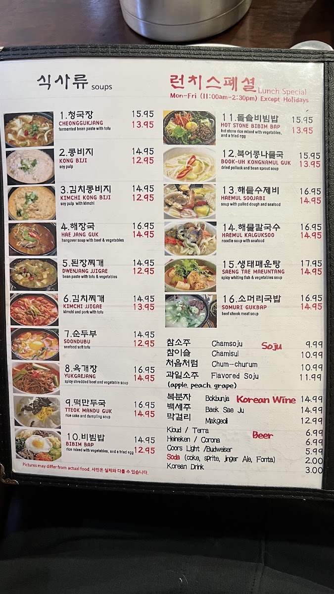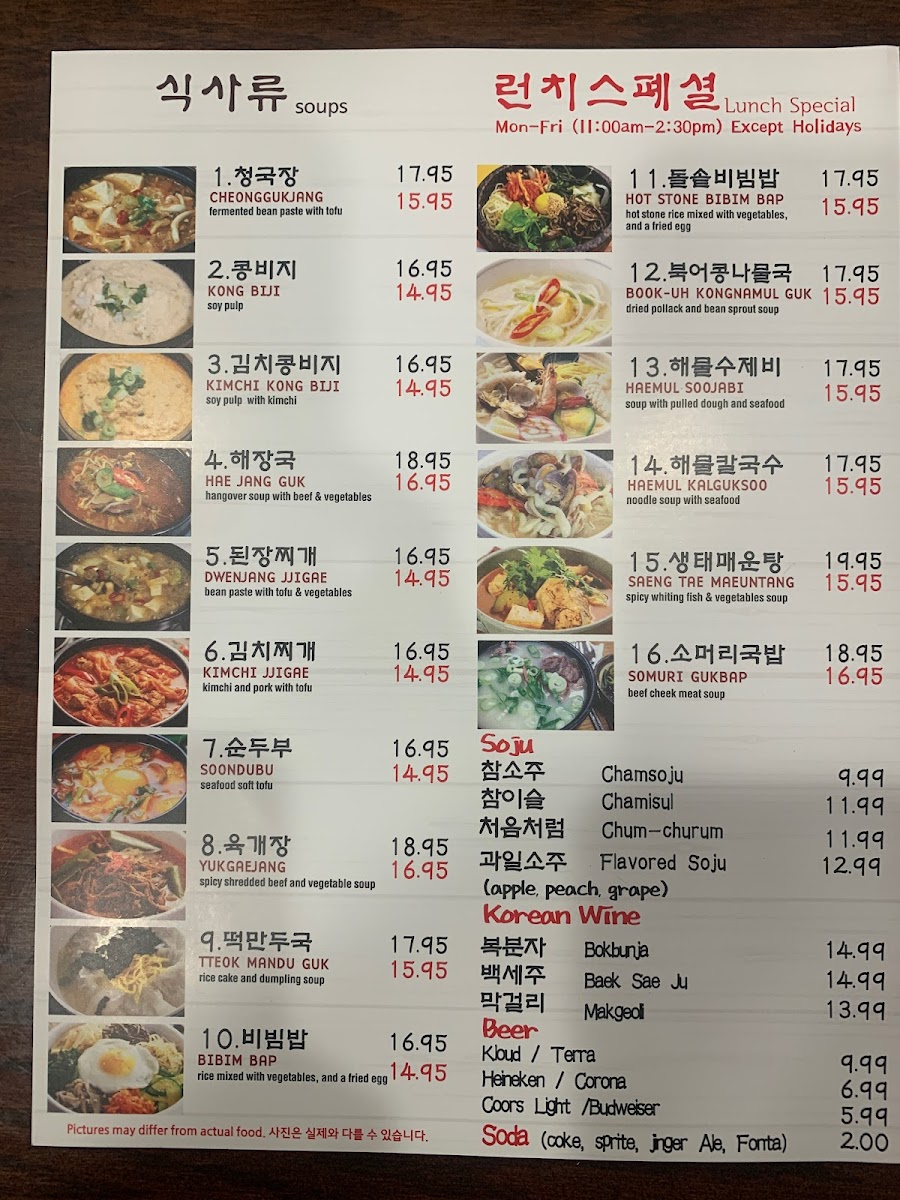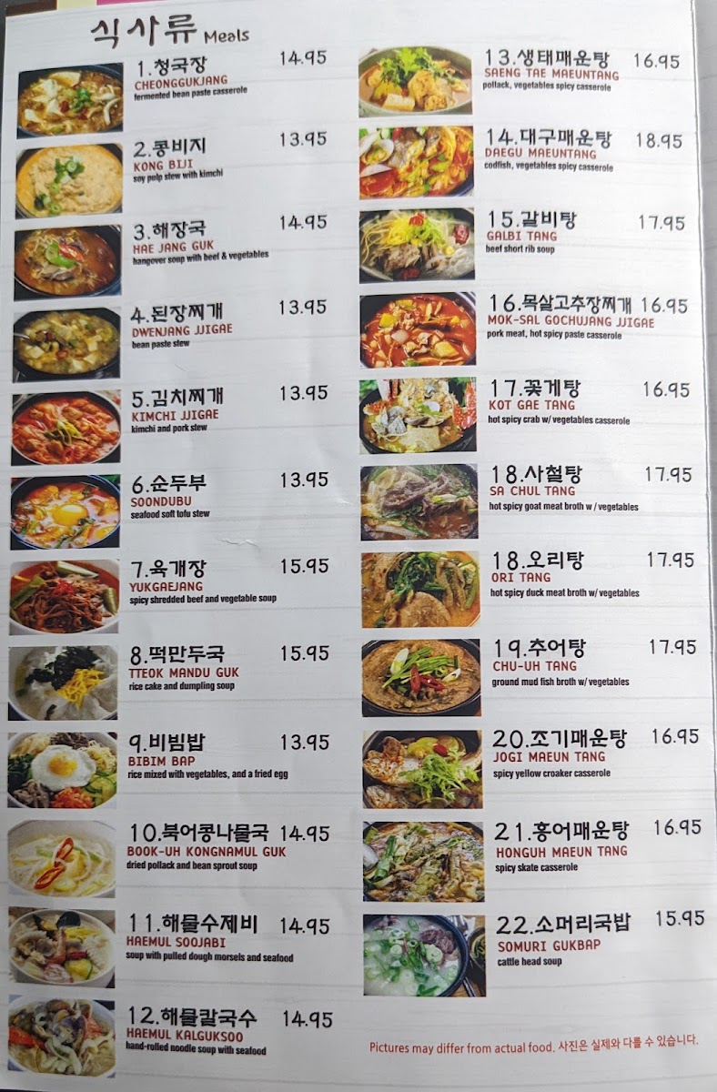 Highlights include standout items such as crab marinated in soy sauce, a variety of banchan (side dishes), kimchi pancake, and hearty stews like Dak Dori Tang. These dishes bring familiar Korean flavors to the table, often enjoyed alongside bowls of rice and cold drinks like Coke or ginger ale. The menu’s soups and stews provide warmth and comfort, making them ideal choices for cooler days or anytime you’re craving something grounding.